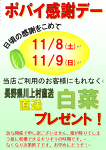 ポパイ感謝デー開催決定!白菜プレゼント!!