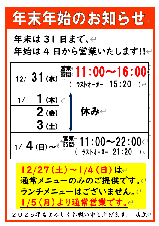 12月31日(水)は16:00までの営業(ラストオーダー15:20)とさせていただきます。