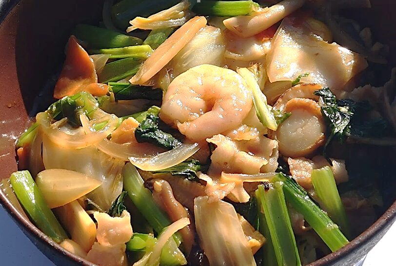 エビ、ホタテ、イカ、豚肉とたっぷりの野菜をポパイ特製の炒めダレで炒めてご飯にのせました。