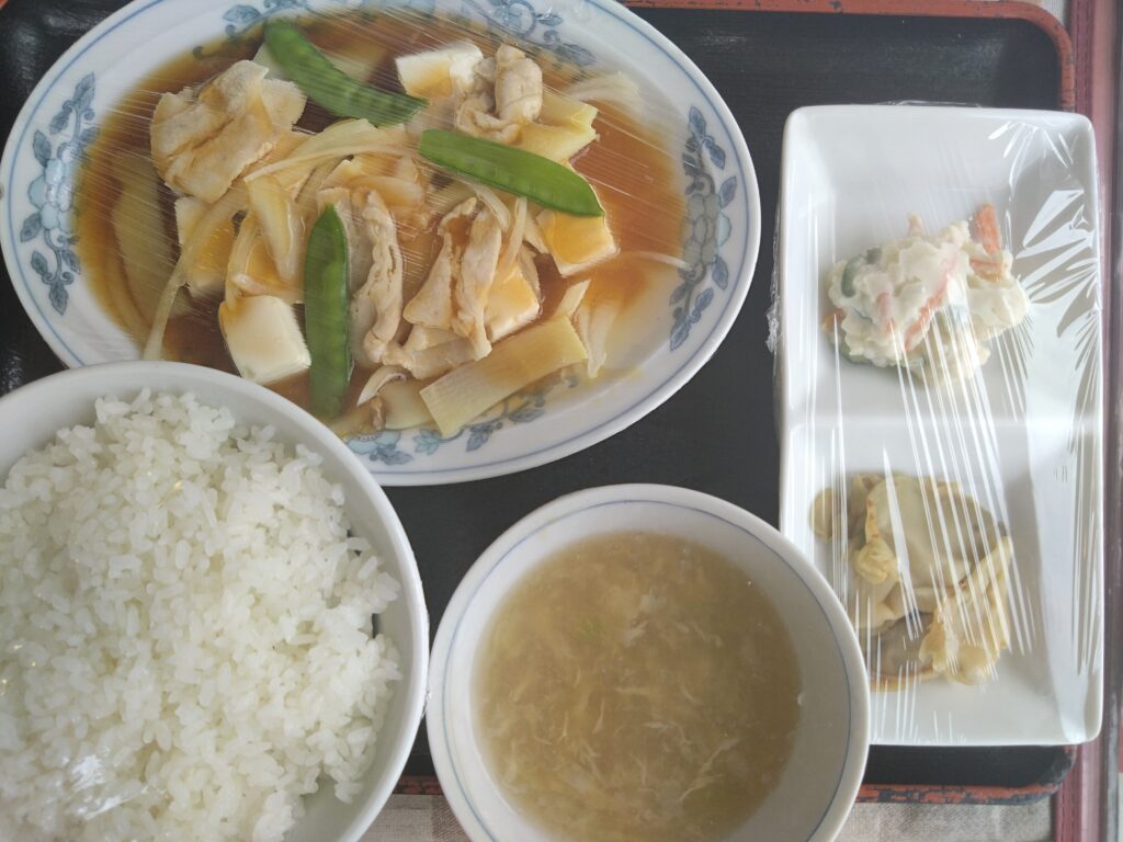 本日のランチは、肉豆腐、ポテトサラダ、ザーサイ、ライス、スープ