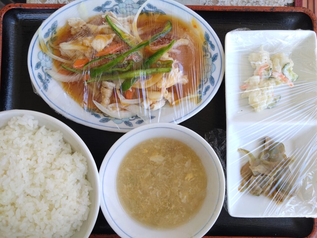 本日のランチは、スタミナ焼肉、ポテトサラダ、ザーサイ、ライス、スープ