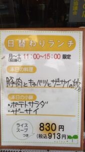 本日のランチは、豚肉とキャベツとザーサイの炒め、ポテトサラダ、ザーサイ、ライス、スープザーサイの塩味と食感がおいしいランチメニューです。 日替わりランチは、月~土曜日(祝日除く)の15:00までの限定ランチです。なくなり […]